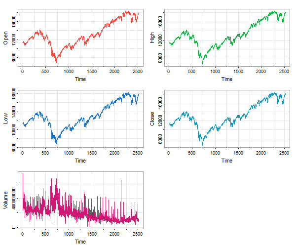 x = ts(rnorm(100, 1000000, 10000), start=3000)